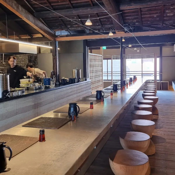 2층으로 올라오면 오픈형 주방에 손님들은 모두 주방을 보면서 라멘을 먹게 되어 있었다. 오로지 라멘에만 집중할 수 있는 구조다. 라멘집이라고 하기엔 너무 세련된 공간이어서 놀랐다. 키오스크로 주문을 마쳤기 때문에 여기서는 따로 그들과 이야길 나눌 필요가 없고 일본 특유의 조용함을 넘어서 고요함까지 느껴졌다.