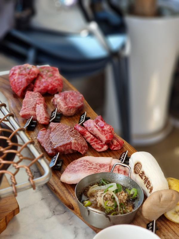 이곳을 처음 방문한 것은 문경 본점이었다. 인스타로 계속 보고 있었던 맛집이었는데 마침 상주로 출장 갈 일이 생겨서 상주에 갔던 차에 이곳에 들리게 되었다. 사진처럼 메뉴 한판에 갖가지 부위별로 고기를 내어줘서 그게 가장 좋았던 것 같다. 그래서 제주 여행을 왔을 때 주저 없이 서귀포점을 찾게 되었다. 대정읍에 위치해 있고 모슬포항에서는 차로 10분 이내 거리다.우리는 갈 때마다 한우한상을 주문하는 편이고 육회가 먹고 싶으면 추가로 주문하곤 했다. 돼지고기도 한우와 마찬가지로 부위별로 나온다. 플레이팅도 참 멋지게 하는 곳이다. 초계 한 마리 2인세트는 꽃등심, 안심, 갈빗살, 부챗살, 제비추리, 손차돌, 한우불고기로 구성되어 있고 제주흑돼지 한 마리 구성은 삼겹살, 목살, 생갈비, 항정살, 갈매기살, 가브리살로 구성되어 있다.매장에는 따로 예약하고 가지 않아도 되었는데 그래도 인원수가 많다면 미리 전화나 인스타디엠을 보내두는 게 좋을듯하다. 이곳의 고기가 맛이 있을 수밖에 없는 건 1.2도의 온도에서 21일간 숙성을 시켜서 나오는 게 그 이유가 아닐까? 내돈내산으로 몇 번을 재방문했던 곳이라 고기는 자신 있게 소개할 수 있다. 한우한판을 주문하면 샤부샤부를 서비스로 먼저 내어주시는데 곁들어 나오는 밑반찬 가짓수는 그리 많지 않지만 맛있게 먹을 수 있는 것들로 내어준다. 사실 식당에 가서 밑반찬이 많을 때 처음에는 좋아서 우와 싶다가도 실질적으로 먹었을 때 가짓수만 채우고 먹을 게 없는 식당도 많다. 하지만 이곳은 맛있게 먹을 수 있는 몇 가지만 줘서 오히려 더 좋았다. 장아찌류가 밑반찬으로 있었는데 고기만큼이나 장아찌류도 맛있었다. 반찬은 다 먹고 나면 셀프서비스로 리필이 가능하다. 식사류는 냉면이나 된장찌개가 있는데 나는 고깃집에서 나오는 계란찜을 좋아해서 된장찌개와 더불어 꼭 같이 주문하는 것이 계란찜이다. 높이 빵빵하게 해 주셔서 기분 좋은 계란찜. 서빙되어 나올 때 어떤 부위부터 먹으라고 간단한 안내를 해주시는데 진짜 작정하고 먹으면 많이 먹겠더라. 육회도 너무 신선해서 별난 엄마 입맛에도 맛있다고 하셔서 모시고 간 보람이 있었다. 매장의 분위기도 바닷가 쪽이라 고깃집 분위기 같지 않은 느낌이다. 특히 야외 테이블을 이용하면 마치 캠핑 온듯한 느낌도 가질 수 있다. 야외 테이블은 애견동반 가능한 것으로 알고 있는데 혹시라도 관심 있는 분들은 매장에 한번 더 확인해 보는 게 좋겠다. 여행 온 느낌 제대로 나면서 고기를 구워 먹을 수 있으니 다음에는 야외 테이블도 이용해보고 싶다. 저녁에 꼬마전구 등이 다 켜질 때는 마치 카페처럼 이쁘더라.