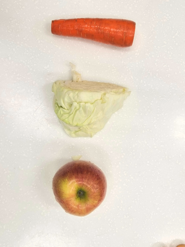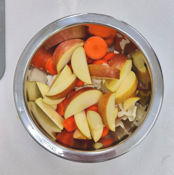 재료: 양배추1/4통, 사과 중2개, 당근 중1개. 까(CCA)주스란 양배추(cabbage), 당근(carrot), 사과(apple)의 의미이다.
