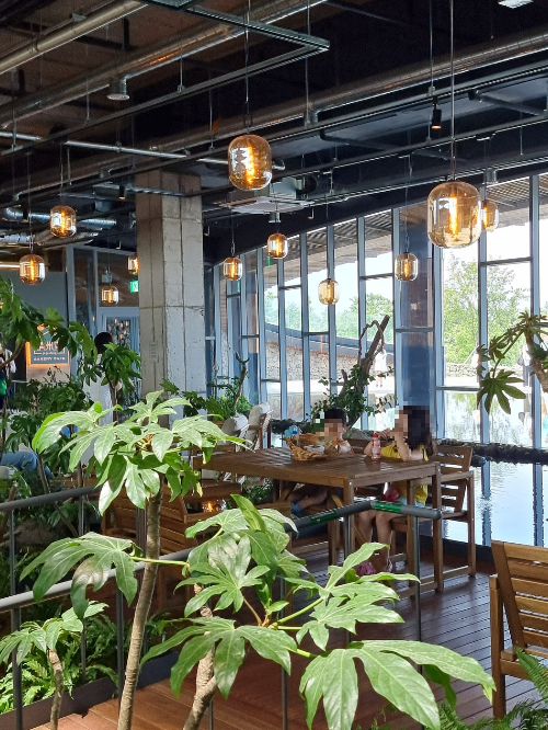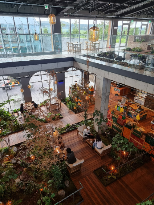 매장 내부로 들어가면 정면으로 보이는 곳이 왼쪽 사진이다. 진짜 넓다. 그렇다고 좌석이 넓은 만큼 꽉꽉 채워진 게 아니라 플랜테리어를 잘해서 각각의 좌석이 방해받지 않게 되어 있어서 좋았다. 1.2층 다하면 좌석수는 꽤 될 것 같은데 아 카페가 800평이라니 아마 제주에서 가장 큰 카페가 아닐까 싶다.