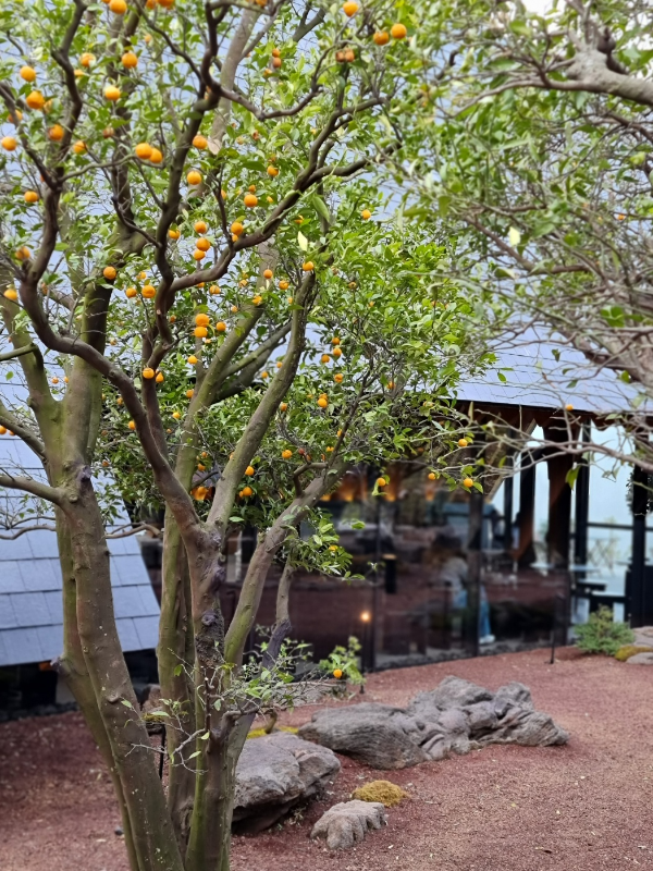 입구를 들어서면 마치 어떤 비밀스러운 공간으로 들어서는 착각이 든다. 삼각지붕의 특이간 건축물은 멀리서 보면 피라미드를 연상케 했는데 중정을 두고 건물이 양쪽으로 나뉘어 있다. 카페 이름에 들어가는 유지는 댕유자의 제주말인 유지에서 따왔다고 하는데 맞는 말인지 모르겠다.