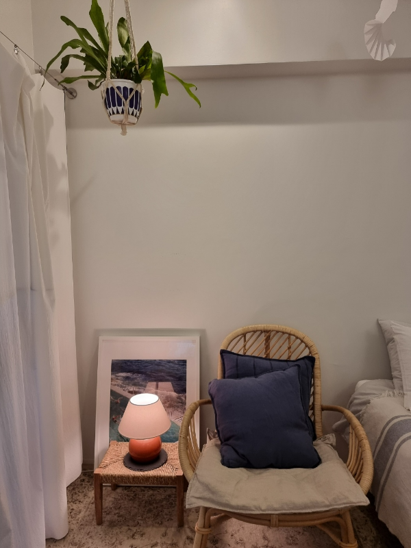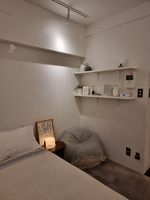 집은 우리나라의 원룸을 생각하면 되는데 욕조가 있는 화장실이 있고 작은 주방이 있다. 전자렌지와 발뮤다 커피팟이 있고 침대와 1인용 쿠션과 의자 그리고 테이블, 에어컨, 전신거울, 티브이가 있는 작지만 알차게 있을 건 다 있으면서도 인테리어를 감성적으로 해뒀다.